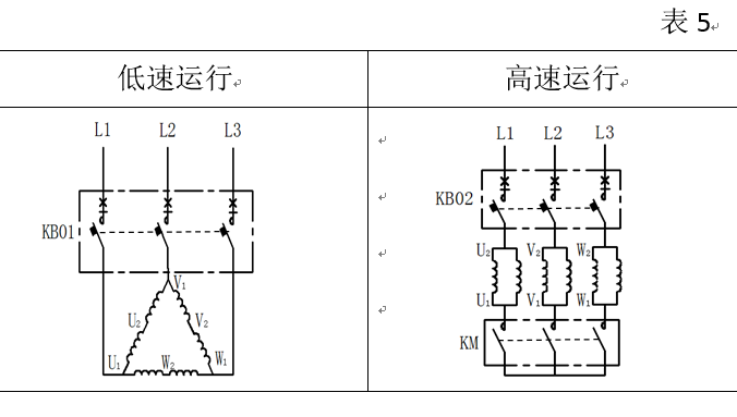 許多場合需要使用雙速電動機如一般工業(yè)建筑、民用建筑、排風兼排煙風機。通常需要兩種風機轉速分別用于正常(平時低速排風)和緊急情況(如發(fā)生火災需要高速排煙),為此需要采用雙速控制器去控制兩種轉速的電動機?;趦膳_KB0輔以適當?shù)慕佑|器等構成KB0D雙速控制器裝置,其控制雙速電動機繞組的接線方式見表5。