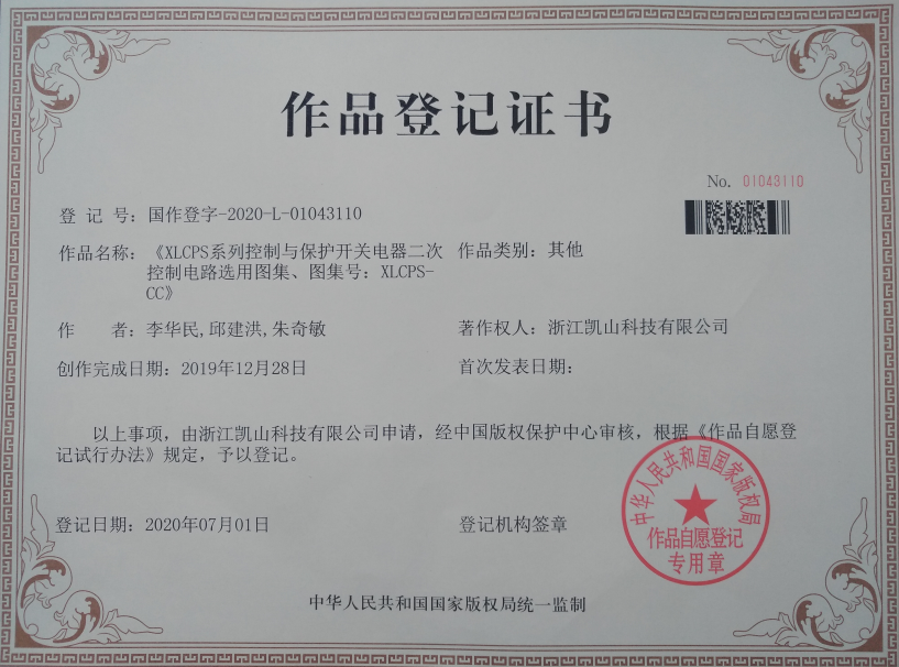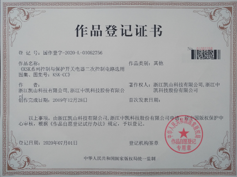 近日,國家版權(quán)局頒發(fā)作品登記證書,由浙江中凱科技股份有限公司全資子公司浙江凱山科技有限公司為著作權(quán)人的兩本在工程設(shè)計及應(yīng)用中的標(biāo)準(zhǔn)設(shè)計圖集獲得作品登記。兩本圖集分別為《XLCPS系列控制與保護開關(guān)電器二次控制電路選用圖集》(圖集號XLCPS-CC)、《KSK系列控制與保護開關(guān)電器二次控制電路選用圖集》(圖集號KSK-CC)。